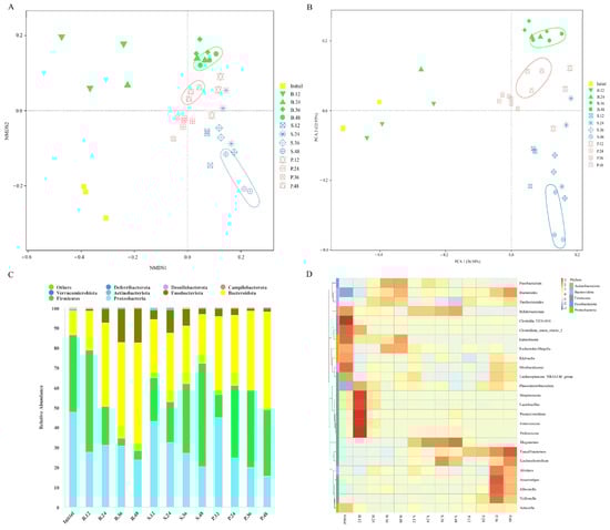 Changes in intestinal microbial community composition. (A) NMDS analysis, (B) PCoA, (C) histogram of abundance distribution at the phylum level, (D) cluster heat map of species distribution at the genus level. Initial, B, S, and P represent the initial point of fermentation and blank, SA, and PSA groups, respectively. The numbers 12, 24, 36, and 48 indicate 12, 24, 36, and 48 h of fermentation, respectively.