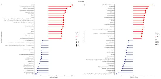 Matchstick charts of the top 20 differential metabolites between the PSA and blank groups. (A) POS mode. (B) NEG mode. Red and blue colors indicate the upregulated and downregulated metabolites, respectively, and the sizes of the circles refer to different VIP values.