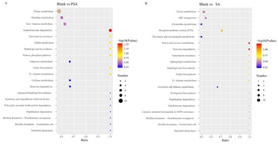 Metabolic pathways associated with differential metabolite changes between different experimental groups. (A) Blank group vs. PSA. (B) Blank group vs. SA. The x-coordinate is x/y (the number of differential metabolites in the corresponding metabolic pathway/the total number of identified metabolites in the pathway). The color of the dots indicates the p-value of the hypergeometric test, and their size denotes the number of differential metabolites in the corresponding pathway.