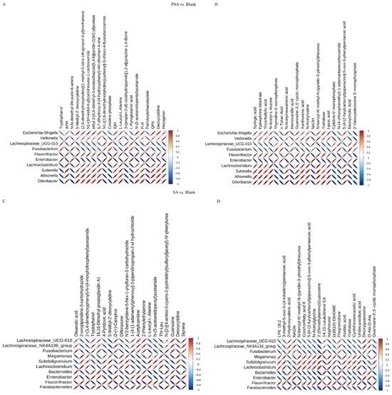 Correlation heat maps of different bacterial genera and metabolites between groups at the genus level. (A) POS mode of PSA vs. blank. (B) NEG mode of PSA vs. blank. (C) POS mode of SA vs. blank. (D) NEG mode of SA vs. blank. The abscissa represents the differential metabolites, and the ordinate indicates the differential bacteria. The legends reveal the correlation coefficient, with red color indicating a positive correlation and blue denoting a negative correlation. The asterisk mark means statistical difference; p < 0.05. The size of the area of the ellipse represents the size of p, and the larger the area, the smaller the p value.