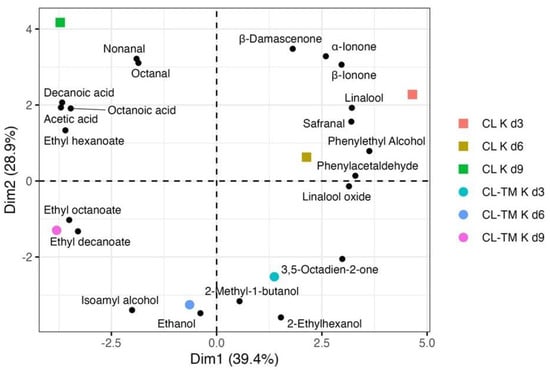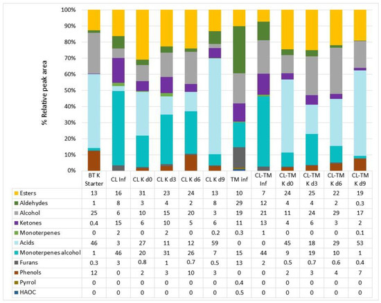 | Volatile Compound | Odor Description | CAS# a | ELRI b | LRI c | BT K Starter | CL Inf | CL d0 | CL d3 | CL d6 | CL d9 | TM Inf | CL-TM Inf | CL-TM d0 | CL-TM d3 | CL-TM d6 | CL-TM d9 |
