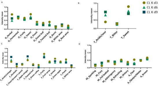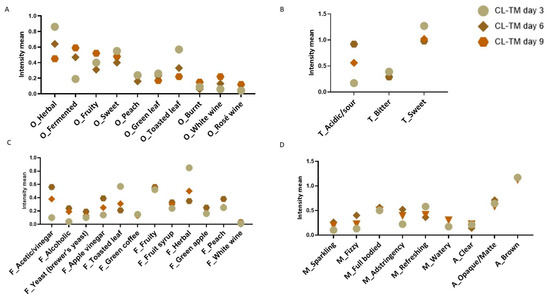 - CL or CL-TM kombucha: CL kombucha beverages (CL K) were prepared by mixing 90% (v/v) CL or CL-TM infusion, 10% (w/v) sugar, 10% (v/v) BT K starter culture, and 2.5% (w/v) of SCOBY and fermented at 23 °C. Sampling was done every 3 days during the 9 days of fermentation (d0, d3, d6 and d9) After fermentation, the samples were collected for analyses of Volatile Organic Compounds (VOCs).