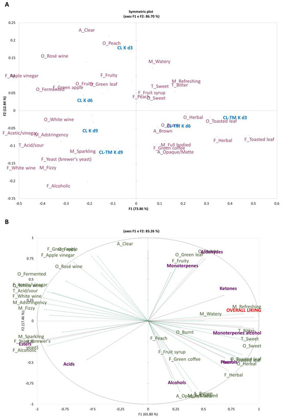 - Infusions: Infusions of BT were prepared at a concentration of 3%, while infusions of CL and CL-TM were prepared at a concentration of 2.5% (w/v), based on preliminary sensory results. Water at 95 °C was poured over the raw material and allowed to steep for 10 min. The leaves were then removed using a traditional sieve for infusion preparation. BT kombucha starter: BT kombucha starter was prepared by mixing 90% (v/v) BT infusion, 10% (w/v) sugar, 10% (v/v) BT K previously fermented (starter culture), and 2.5% (w/v) of the SCOBY and was fermented at 23 °C for 9 days to be used as a starter (pH = 2.8 ± 0.05) for the other beverages. After fermentation, samples were collected for Volatile Organic Compound (VOC) analyses.