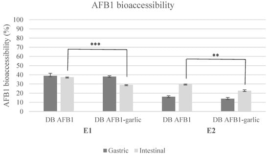 In the last few years, AFB1 bioaccessibility has been studied in different food matrices by including functional ingredients. The inclusion of functional ingredients as a strategy to reduce exposure to AFB1 has offered promising results. Escrivá et al. [] measured AFB1 bioaccessibility by using AFB1-contaminated wheat flour in the bread recipe, achieving concentrations of 78–164 µg AFB1/kg bread with and without 1% goat milk whey, fermented whey, or lyophilized pumpkin. After performing simulated human digestion, the intestinal AFB1 bioaccessibility was reduced by 64% when including 1% goat milk whey in the bread recipe, 57% with 1% fermented whey, and 74% with 1% lyophilized pumpkin. In this work, the intestinal AFB1 bioaccessibility reduction when including garlic was 7–8%, which may seem small compared with the reduction reported by Escrivá et al. []. Nevertheless, the total AFB1 bioaccessible fraction when including functional ingredients was smaller in this work, which used garlic. The main difference between these two studies is the AFB1 bioaccessibility result for AFB1-contaminated bread without functional ingredients. For Escrivá et al. [], the result was 114%, while in this work, it was 38–29%. This may be caused by the different AFB1 concentrations used.