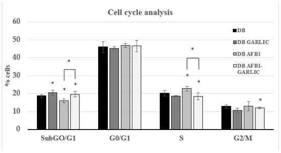 Effect of intestinal digests on Jurkat T cell cycle as assessed by flow cytometry. Cells were exposed for 7 days to bread digest (DB); garlic bread digest (garlic DB); AFB1 bread digest (0.7 µM) (AFB1 DB); and AFB1 (0.7 µM) + garlic (AFB1–garlic DB) bread digest. AFB1 concentration after both AFB1 and AFB1 + garlic exposures was 0.7 µM. p < 0.05 (*). Mean ± standard deviation (n = 4).