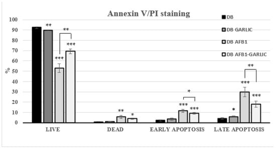 Effect of bread intestinal digest on apoptosis/necrosis as assessed by flow cytometry. Significant differences from the control, indicated by Jurkat T cells, compared with samples exposed for 7 days to bread digest (DB); bread digest garlic (garlic DB); AFB1 (0.7 µM) bread digest; and AFB1 (0.7 µM) + garlic bread digest. p < 0.05 (*), p < 0.01 (**), p < 0.001 (***). Mean ± standard deviation (n = 4).