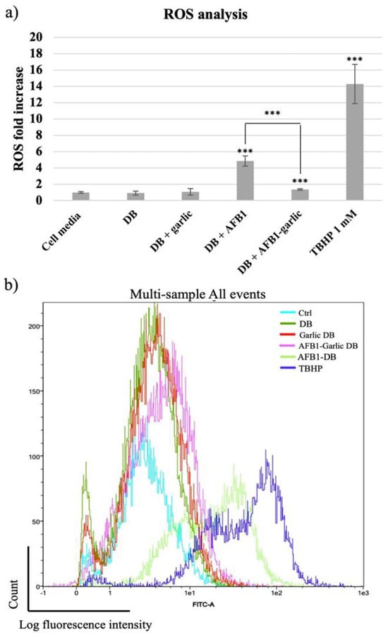 (a) Bar plot showing ROS production in Jurkat T cells exposed for 7 days to cell media, bread digest (DB); garlic DB; AFB1 DB; and AFB1–garlic DB in relation to DB. AFB1 concentration in both AFB1 DB and AFB1–garlic DB conditions was 0.7 µM. (b) Fluorescence representation obtained by overlaying the single plot of each condition by flow cytometry. ROS: reactive oxygen species; TBHP: tert-Butyl hydroperoxide. p < 0.001 (***). Mean ± standard deviation (n = 4).