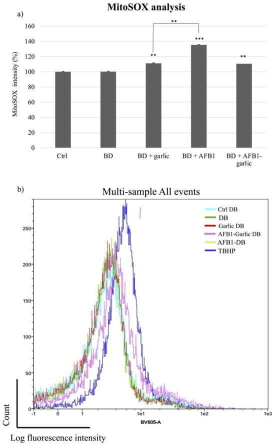 Effect of intestinal bread digests (0.7 µM) compared with control on mitochondrial ROS as assessed by flow cytometry. Significant differences from the control indicated as p < 0.01 (**), p < 0.001 (***). (a) Bar plots showing Jurkat T cells exposed for 7 days to control (non-exposed cells), digested bread (DB), garlic DB, AFB1 DB, AFB1 + garlic DB, and the negative control, and then stained with MitoSOX for flow cytometry detection. AFB1 concentration for both A and A + G exposures was 0.7 µM. (b) Fluorescence representation obtained by overlaying the single plot of each condition by flow cytometry. Mean ± standard deviation (n = 4).