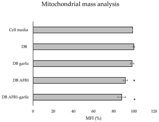 Effect of intestinal bread digests (0.7 µM) compared with control on mitochondrial mass as assessed by flow cytometry. Significant differences from the control indicated as p < 0.05 (*). Jurkat T cells were exposed to each exposure for 7 days (non-exposed cells), digested bread (DB), garlic DB, AFB1 DB, AFB1–garlic DB, and then fixed and stained with MitoTracker® for flow cytometry detection. AFB1 concentration for both AFB1 DB and AFB1–garlic DB exposures was 0.7 µM. MFI: median fluorescent intensity. Mean ± standard deviation (n = 3).
