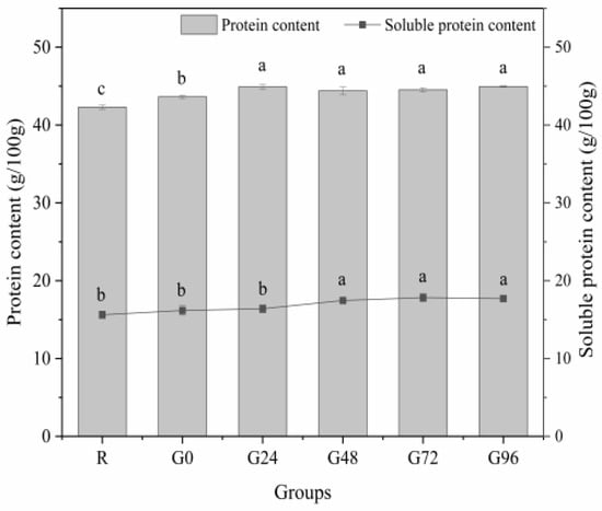 Figure 1. Total protein and soluble protein content of the germinated black bean powder. Different letters (a–c) indicate significant differences between the mean values of different samples (p < 0.05).