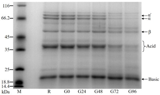 The molecular weight of the germinated black bean protein isolate was determined using SDS-PAGE. The molecular weight of the germinated black bean protein isolate samples ranged from 18.4 kDa to 116 kDa and primarily consisted of globulin, specifically 7S globulin and 11S globulin. Based on Teraishi’s findings and considering the relative molecular weight, the black bean protein isolate’s 7S globulin group was classified into α′, α, and β subunits. Additionally, the 11S globulin component was further categorized into acidic and basic subunits [56]. It can be seen from our results in Figure 2 that the electrophoretic band density of the germinated black bean protein isolate samples changes such that the number of protein bands with a larger molecular weight decreases or density decreases while that of protein bands with a smaller molecular weight appear or density increases. An electrophoretic map reveals that the strip densities of the α′, α, β, and acid subunits noticeably decrease after germination. This change becomes more pronounced as the germination time increases.