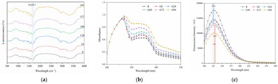 Proteins exhibit a distinct absorption spectrum in the ultraviolet region, with the absorption peak (260–280 nm) corresponding to the absorption of aromatic amino acid residues [63]. As depicted in Figure 3b, UV spectrum scanning of the germinated black bean protein isolate revealed an absorption peak at 260–280 nm. Moreover, the UV absorption intensity of the germinated black bean protein isolate exhibited a continuous increase, suggesting that the protein structure was stretched.