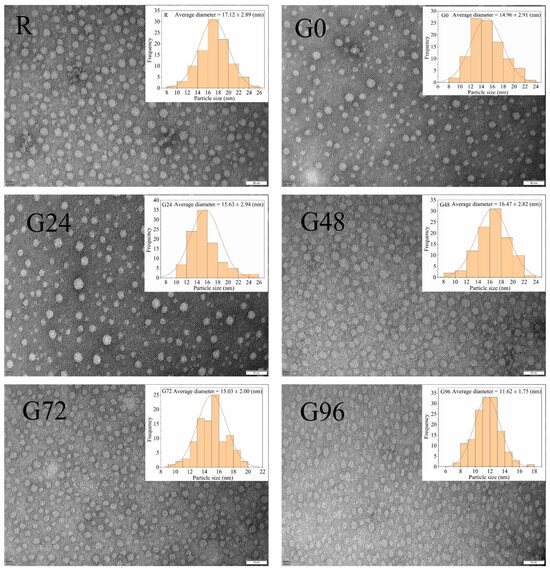 The particle size of the black bean was observed using a transmission electron microscope. The germinated black bean protein solution was adsorbed onto a carbon-coated grid, followed by two washes with double-distilled water. Subsequently, the sample was negatively stained using 2% uranyl acetate and imaged using an JEM-2100Plus transmission electron microscope (JEOL (Beijing) Co., Ltd., Beijing, China) [26]. The zeta potential measurement was obtained utilizing a PALS-Zeta potentiometer. A sample solution with a concentration of 0.5 mg/mL was meticulously prepared in a PBS buffer (50 mmol/L, pH 7.0), comprising a total volume of 1 mL, and subjected to analysis at an ambient temperature of 25 °C.