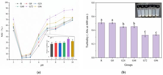 Figure 5. Solubility (a) and turbidity (b) of the germinated black bean protein isolate. Note: Different letters (a–c) indicate significant differences between the mean values of different samples (p < 0.05).