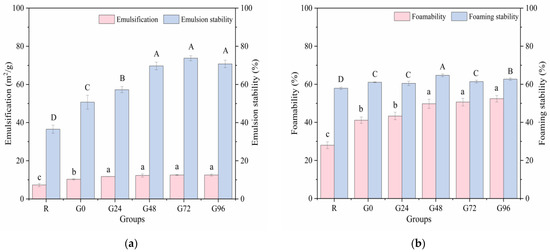 Figure 6. Emulsification (a) and foamability (b) of the germinated black bean protein isolate. Note: Different letters indicate significant differences between the mean values of different samples (p < 0.05).
