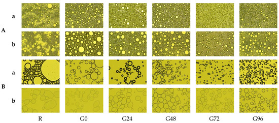 Figure 7. Emulsification state (A) and foaming changes (B) of the germinated black bean protein isolate’s microstructure ((a) Picture taken after 1 min of homogenization; (b) picture taken after 1 min of homogenization and standing for 30 min; the magnification is 40 times).