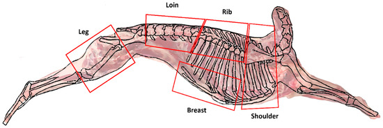 Twenty-five TNAN crossbred goat kids were brought from 3 different farms in the northeast part of Thailand to the SUT farm. They were then randomly allotted into 3 lots/houses, each containing 6–7 animals. Each house (represented as lots of samples) was an enclosed system with adequate ventilation and a slatted floor, allowing adjacent animals to see and interact with each other. The goats were reared indoors on a maize silage-based ration with free access to hay and straw for 4 months until they were ready for slaughter. For primal cut preparation, all 25 goats averaging 17.80 ± 5.43 kg were slaughtered in a commercial slaughterhouse. The carcass, after chilling at 2 °C for 24 h, was dressed into 5 primal cuts including (1) shoulder, (2) rib, (3) loin, (4) breast, and (5) leg, as depicted in Figure 1. All analyses were performed by randomly selecting the cuts from the 3 different lots, and each lot was analyzed with 3 replicates.