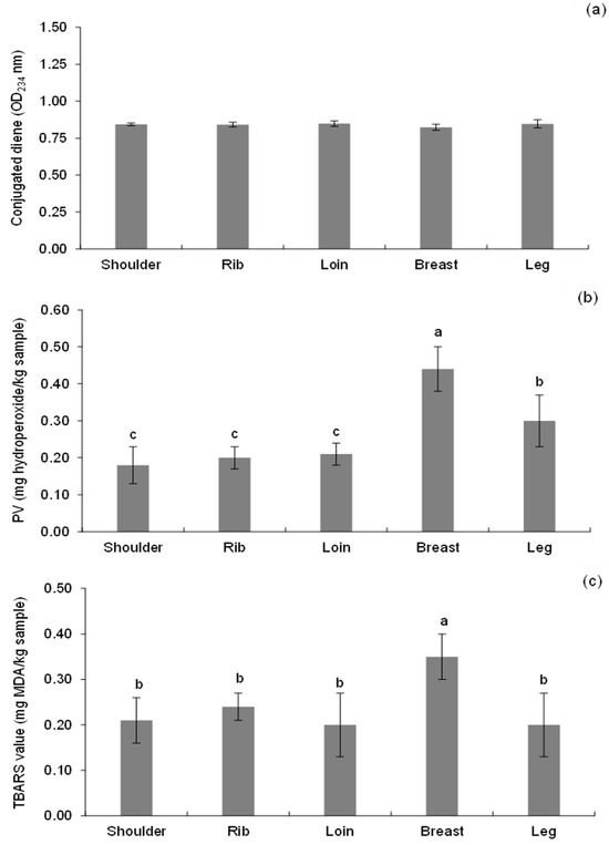 Lipid oxidation products. (a) Conjugated diene (OD234), (b) peroxide value (PV), and (c) thiobarbituric acid reactive substances (TBARS) value (c) of various goat primal cuts. Different lowercase superscripts indicate the significant difference (p < 0.05).