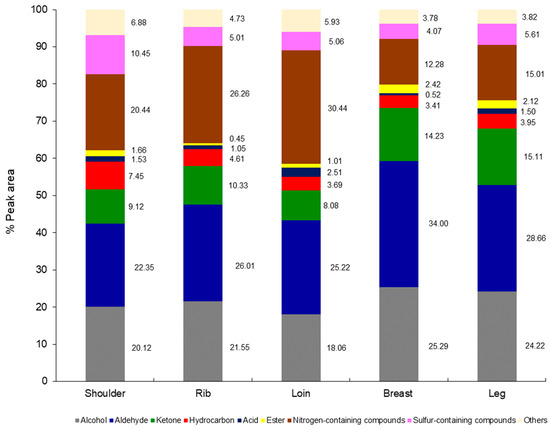 Various goat primal cuts were grilled and subjected to determine their volatile compounds using SPME-GCMS. Based on their chemical functions, the compounds were classified into nine groups: alcohol, aldehyde, ketone, hydrocarbon, acid, ester, nitrogen- and sulfur-containing compounds, and others, as shown in Figure 3. It was found that all cuts contained alcohols and aldehydes as major volatiles, accounting for more than 20% of the total peak area. However, each cut contained various proportions of each volatile group, i.e., the breast and leg cuts had a higher proportion of aldehydes and ketones than the shoulder, rib, and loin cuts. While all three of the latter contained a higher proportion of nitrogen-containing compounds than the breast and leg cuts. The results greatly correlated with the difference in their chemical compositions, particularly the protein and fat contents, described as follows.
