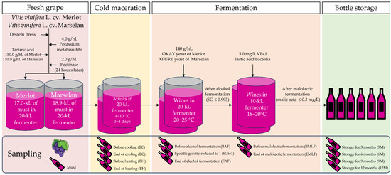 In 2021, an experiment was conducted at Chateau Zhihui Yuanshi (38°28′ N, 106°12′ E), located in the eastern foothills of the Helan Mountains, Ningxia, China. V. vinifera L. cv. Marselan and V. vinifera L. cv. Merlot were harvested from the vineyards. The grapes underwent destemming and sorting on an LXZDS-5 sorting table obtained from Leading Machinery, Xinxiang, China, to remove any diseased or unripe berries. Approximately 17,000 kg of ‘Merlot’ and 18,900 kg of ‘Marselan’ grapes, respectively, were gently crushed and added to a 20-kiloliter (kL) fermenter along with 4.0 g/hL of K₂S₂O5 and 2.0 g/hL of pectinase. To compensate for the low titratable acid content in the grapes, 150 g/hL of tartaric acid was added for ‘Merlot ‘and 110 g/hL for ‘Marselan’. The mixture was then cold macerated at 4–10 °C for 3–4 days. At a temperature of 20 °C, 14.0 g/hL of OKAY yeast (LALLEMAND, Niagara-on-the-Lake, ON, Canada) and XPURE yeast (Laffort, Bordeaux, France) were added for ‘Merlot’ and ‘Marselan’, respectively, to initiate alcohol fermentation. The fermentation process was carried out at a temperature range of 20–25 °C, with the wine being pumped every 8 h for 20 min from the beginning of cold maceration until the end of alcohol fermentation. Throughout alcohol fermentation, the temperature and specific gravity of the wine were closely monitored. When the specific gravity reached about 0.993, the alcohol fermentation process was considered complete. The wine was then transferred to a 10-kL fermenter after racking, to initiate malolactic fermentation by using 5.0 mg/L VP41 lactic acid bacteria (Enartis, Niagara-on-the-Lake, ON, Canada). The temperature was controlled at 18–20°C. After the malolactic fermentation was complete, indicated by a malic acid level falling below 0.3 mg/L, the sulfur dioxide concentration in the wine was adjusted to 20 mg/L. Then, the wine was bottled for storage in a cellar with a constant temperature of 16–18 °C and a relative air humidity of 60–70% (Figure 1).