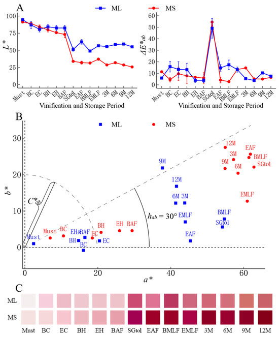 Variation in chromaticity index (A,B) and color (C) of ‘Merlot’ and ‘Marselan’ wines during fermentation and bottle storage. The descriptions of each period on the horizontal axis are given in Table S1 (the same below).