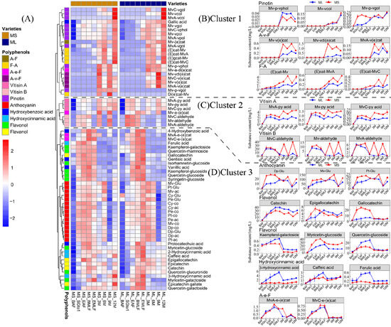 Evolution of phenolic compounds during cold maceration before fermentation. (A) Clustered heat map of the concentrations of phenolic compounds. (B) The changes in the concentration of representative four anthocyanins and four flavan-3-ols in Cluster 1. (C) The changes in the concentration of representative four anthocyanins and three phenolic acids in Cluster 2. (D) The changes in the concentration of representative four anthocyanins, three Vitisin B, and non-anthocyanin phenols in Cluster 3.
