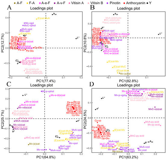 Regarding the ‘Marselan’ wine, the yellow hue was found to be related to the evolution of three Vitisin A components (Mv-py acid, MvA-py acid, MvC-py acid) (Figure 5D). Besides, seven pinotin-type compounds (Mv-vpol, Mv-vcol, Mv-vgol, MvA-vpol, MvA-vcol, MvC-vphol, MvC-vgol) were found to be closely associated with hab and b* values in the third quadrant, distinguishing it from the ‘Merlot’ wine. The grape-derived anthocyanins, F-A type polymeric pigments ((E)cat-Mv, (E)gcat-Mv, (E)cat-MvA, (E)cat-MvC), and A-F type polymeric pigment (Mv-(e)cat), as well as the a* value, were all positioned in the positive X axis region, indicating their contribution to the red hue (Figure 5D).