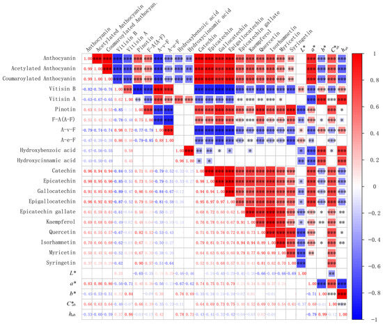 Correlation between the concentrations of phenolic compounds and chromaticity index in the ‘Merlot’ and ‘Marselan’ wines. The “*”, “**”, and “***” represented that the correlations were statistically significant, which means p < 0.05, p < 0.01, p < 0.001, respectively.