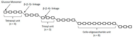 The cereal (1,3)(1,4)-β-d-glucans, also known as β-d-glucans, are polysaccharides predominantly found in the cell walls of plants belonging to grasses [3]. Cereal β-d-glucans, particularly those from oats and barley, possess specific molecular-structural characteristics that distinguish them in molecular weight (MW), degree of branching, and linkage types from the next important β-d-glucan sources, such as fungi and yeasts [2,4]. Cereal β-d-glucans are polysaccharides consisting of linear chains of D-glucopyranosyl residues connected by a combination of β-(1,4) and β-(1,3) linkages [5] (see Figure 1).