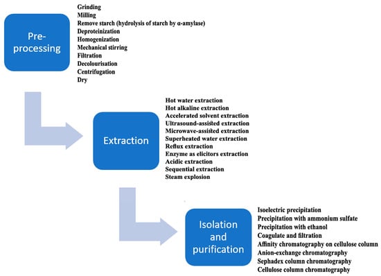 Commonly used methods for β-d-glucan extraction from cereals on an industrial scale include hot water, alkali, enzyme (as elicitor), solvent, and superheated water [18]. The typical extraction process of cereal β-d-glucans includes three main steps (pre-processing, extraction, and isolation). The schematic for β-d-glucan production under laboratory or pilot plant conditions is presented in Figure 2.