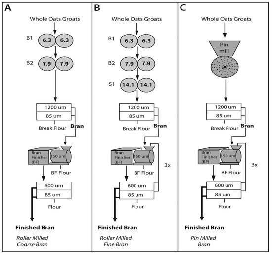 (A–C) Three ways of oat bran preparation using roller and pin milling techniques [52]. Three bran types were generated through roller and pin milling methods. Initially, groats were coarsely ground using corrugated rolls, followed by further size reduction with finer corrugations. Oat bran was formed from fractions retained on 600 μm and 85 μm sieves, while the fine fraction became break flour. Roller-milled coarse bran (A) combined coarse fractions from the second break system, roller-milled fine bran (B) involved narrowing gap sizes and using additional sizing rolls, and pin-milled bran (C) was produced through pin milling and subjected to sieving and bran finishing processes similar to roller-milled bran [52].