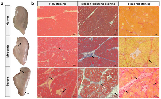 Representative cases of normal breast fillets and of moderate and severe WB fillets are shown in Figure 1a. Normal breast fillets exhibited consistent softness and flexibility, while WB fillets were palpably tough. Specifically, moderate WB fillets showed hardness in the cranial area but flexibility in the mid to caudal region, whereas severe WB fillets were characterized by extreme rigidity from the cranial region to the caudal tip. In addition, severe WB was accompanied with petechial hemorrhage and edema on the dorsal surface. These morphologic features were in accordance with previous findings [2,30]. As exhibited in Figure 1b, H&E staining showed tightly packed muscle fibers in the normal group, whereas WB samples exhibited aggregation of mononuclear cells, myodegeneration, necrosis, and lipid and connective tissue infiltration (indicated by arrows). Masson Trichrome staining and Sirius red staining demonstrated a significant accumulation of collagen in WB muscles, especially in the endomysial and perimysial spaces, in a similar manner to previous studies [6,7]. In addition, these pathological features became aggravated as the severity of WB myopathy increased.