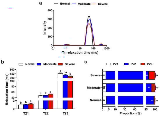 Relaxation properties of pectoralis major muscles affected by varying degrees of WB condition. (a) Distributions of transverse relaxation times (T2) for normal, moderate and severe WB muscles. (b) Transverse relaxation times (T21, T22 and T23) obtained from normal, moderate and severe WB muscles. (c) Relative populations (P21, P22 and P23) obtained from normal, moderate and severe WB muscles. All results are presented as mean ± SE (n = 12) with different superscript letters (a–c) denoting significance (p < 0.05).