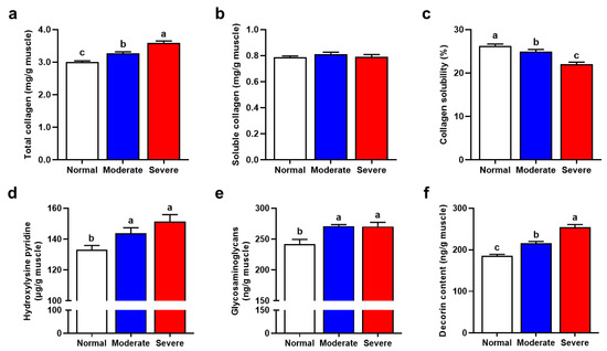 IMCT compositions affected by varying degrees of WB condition. (a–c) Content of total collagen and heat soluble collagen, as well as the collagen solubility in normal, moderate and severe WB muscles. (d–f) Content of hydroxylysyl pyridoxine, glycosaminoglycan and decorin in normal, moderate and severe WB muscles. All results are presented as mean ± SE (n = 12) with different superscript letters (a–c) denoting significance (p < 0.05).