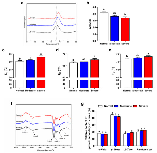 The denaturation temperature and enthalpy reflect protein thermal stability. Higher values are indicative of better thermal stability [53]. With an increase of the severity of WB myopathy, the thermal transition temperature shifts towards a higher temperature (Figure 4a). The denaturation temperatures of To (onset temperature), TM (maximum temperature) and TE (end-point temperature) of IMCT isolated from severe WB muscle were significantly increased compared with the normal IMCT (p < 0.05). While the denaturation enthalpy (ΔH) showed an opposite trend (p < 0.05, Figure 4b–e). The thermal stability and mechanical stability of IMCT are primarily due to the chemical properties of collagen molecules [12]. Kopp et al. [54] have found that the ΔH of collagen in IMCT decreases with an increase of collagen crosslinking. Zhu et al. [17] have also indicated that the change of IMCT structure crosslinking in WB is the main reason for the decrease of ΔH. Therefore, the changes of collagen content and the differences in cross-linking of IMCT are the main reasons for the difference of denaturation ΔH between normal and WB chicken muscle.
