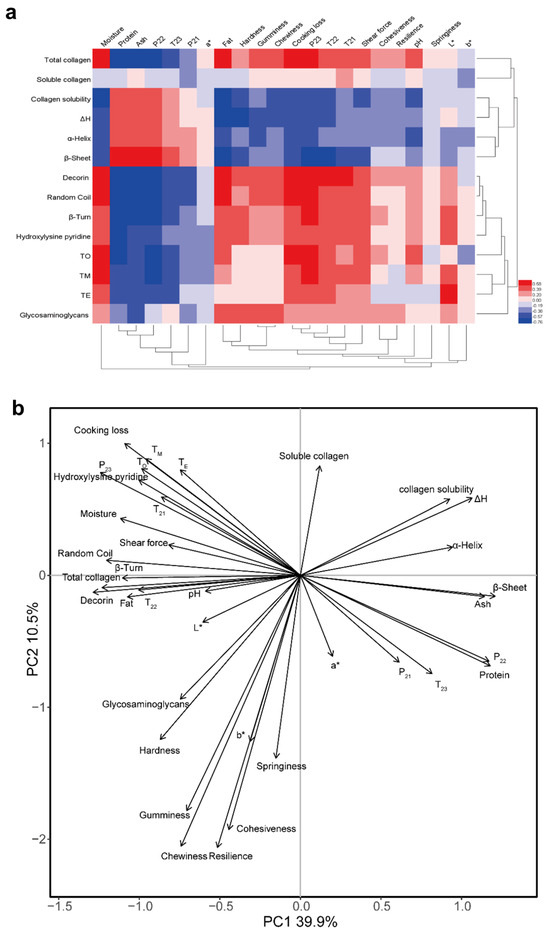 Relationship among physiochemical characteristics of intramuscular connective tissue, chemical composition, meat quality traits and textural properties of pectoralis major muscles affected by varying degrees of wooden breast (WB) condition. (a) Heat map illustrating correlation coefficients among variables. Red color indicates positive correlation, whereas blue color indicates negative correlation. (b) Loading plot of the first two principal components (PCs) of a principal component analysis.