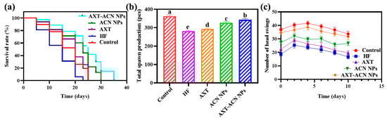 Effects of astaxanthin nanoparticles on (a) life span, (b) total oviposition, and (c) head swing times of high-fat C. elegans. Different letters indicate significant difference (p < 0.05).