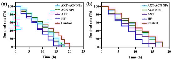 Effects of astaxanthin nanoparticles on the survival rate of high-fat C. elegans under (a) heat stress and (b) oxidative stress.