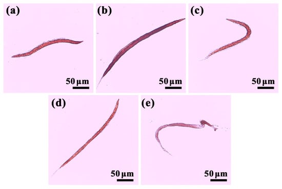 The nematode growth medium (NGM) was prepared before culturing. Briefly, 17 g of agar, 3 g of NaCl, and 2.5 g of tryptone were dissolved into a mixed solution of 2.5 mL of 1 M phosphate buffer and 97.5 mL of distilled water. Subsequently, the mixture was sterilized in a 121 °C autoclave, which was cooled to 60 °C in a water bath for further use. Then, 1 mL of 1 M CaCl2 solution (sterile), 1 mL of 1 M MgSO4 solution (sterile), and 1 mL of sterile cholesterol (5 mg/mL in ethanol) solution were transferred to the solution prepared in the last step. The well-mixed solution was then poured into the Petri dish, and the NGM was successfully prepared.