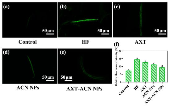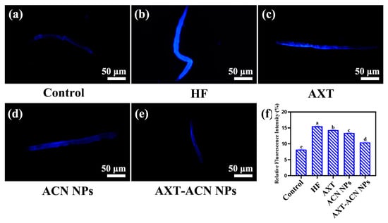 Lipofuscin, a native blue autofluorescent pigment, has been proposed as a stress and aging biomarker in C. elegans, as stress promotes the formation of this pigment due to oxidative degradation and autophagy of cellular components [22,25]. Excessive accumulation of lipofuscin in nematodes may accelerate the aging process by causing oxidative stress [26]. Figure 4a–e display fluorescence microscopy images of nematodes in the control, HF, AXT, ACN NPs and AXT-ACNs NPs groups, respectively. Noticeably, nematodes treated with AXT, ACN NPs and AXT-ACNs NPs exhibited a notable reduction in lipofuscin levels in comparison to the HF group, which suggests that the AXT-ACNs NPs can effectively attenuate lipofuscin accumulation in C. elegans.