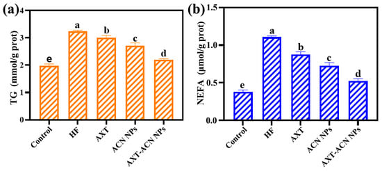 Effects of the astaxanthin nano-delivery system on contents of (a) TG and (b) NEFA in high-fat nematodes. Different letters indicate significant difference (p < 0.05).
