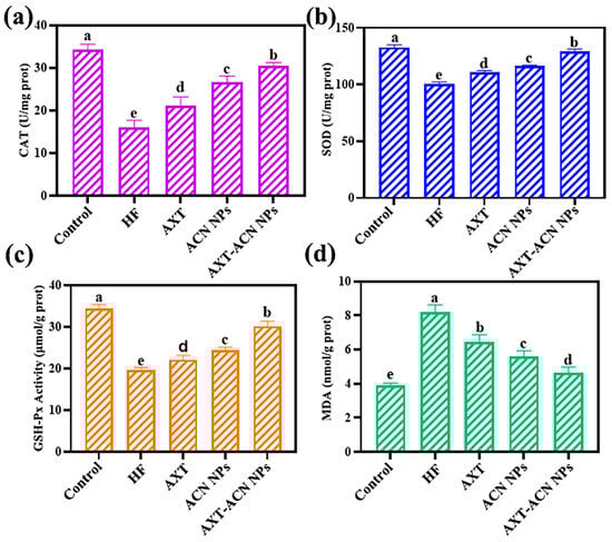 Effects of astaxanthin nano-delivery System on the contents of (a) CAT, (b) SOD, (c) GSH-Px and (d) MDA in high-fat nematodes. Different letters indicate significant difference (p < 0.05).
