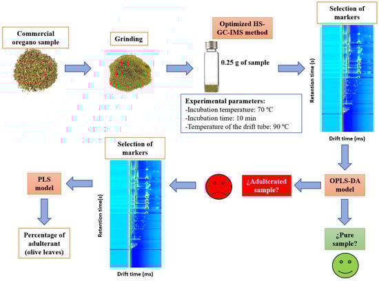 Ion mobility spectrometry (IMS) has proved its great potential in the fight against food fraud by analyzing volatile organic compounds (VOCs) [,], but it has never been used for oregano quality control. Its fast response, high sensitivity, low operation cost, and minimal sample treatment explain the efficiency of this technique in many fields such as the agri-food and clinical fields []. The use of IMS as a GC detector increases the selectivity due to the previous separation of VOCs in the chromatographic column []. With GC-IMS, organic compounds are separated according to GC retention time and IMS drift time. The large amount of data provided by GC-IMS demands the use of data processing. In this work, the potential of IMS to evaluate the adulteration of oregano samples was explored for the first time. A non-targeted approach was applied to oregano VOC profiles obtained with headspace–gas chromatography coupled to ion mobility spectrometry (HS-GC-IMS) using chemometric tools such as orthogonal partial least squares-discriminant analysis (OPLS-DA) and partial least squares (PLS) to detect oregano samples adulterated with olive leaves and quantify the percentage of this adulterant, respectively. In addition, a targeted analysis was carried out, and some oregano and olive leaf volatiles were identified and quantified.