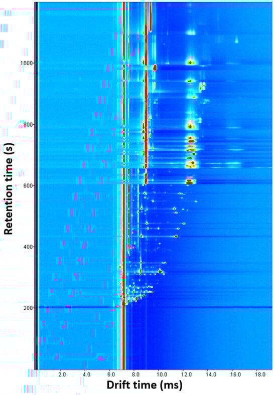 Two capillary chromatographic columns were tested: a polar DB-WAX (100% polyethylene glycol) column and a non-polar HP-5MS-UI (5% diphenyl and 95% dimethylpolysiloxane) column. The polar one showed lower selectivity than the non-polar one because the signals overlapped more, especially at retention times longer than 500 s and drift times between 7 and 10 ms (Supplementary Materials Figure S1). For this reason, the non-polar column was chosen for the next experiences.