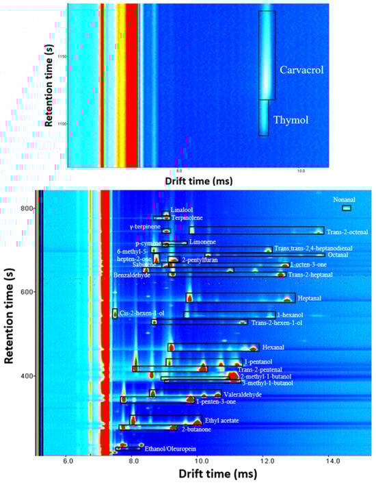 Dilutions at 10 µg g−1 were prepared and measured with the optimized HS-GC-IMS method. In the cases of carvacrol and thymol, solutions at 1000 µg g−1 were used because no signals were observed at 10 µg g−1. The quantity of solutions transferred to the vials was the same as the optimized amount of sample, which was 0.25 g. A total of 30 compounds were present in oregano and/or olive leaves. The identification was based on the retention and drift times of VOCs (Supplementary Materials Table S2). Ethanol and oleuropein produced exactly the same protonated monomer and proton-bound dimer signals, so they were ruled out due to a lack of selectivity. Despite this, the developed method allows one to separate, monitor, and identify 30 volatiles at the same time.