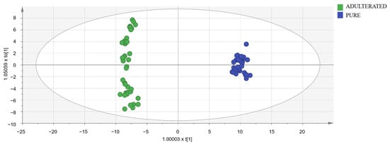 Two different chemometric models based on OPLS-DA and PLS were developed, and several scaling methods, such as unit variance (UV) scaling and Pareto (Par) scaling, were tested. OPLS-DA was proposed to differentiate adulterated from unadulterated samples, while the PLS model was used to quantify the percentage of adulterant in samples classified as adulterated by OPLS-DA. All of the proposed methodology is summarized in Figure 1.
