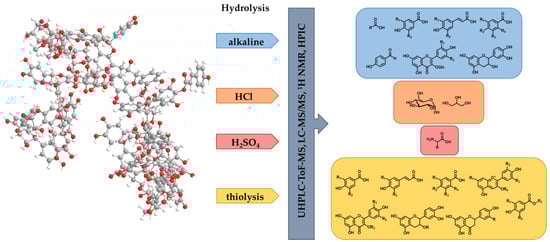 Although the composition of red wine polymers was already analyzed in the literature using HPLC-UV/vis, HPIC, HPLC-ESI-FT-ICR-MS, and LC-MS/MS, only 50% of the polymer’s complex structure have been characterized so far [,]. To identify new chemical degradation products, new approaches for the analysis of the chemically treated HMW fractions, such as 1H NMR experiments and untargeted UHPLC-ToF-MS measurements, were performed. Further, the amount of the degradation compounds was determined for different reaction conditions via HPIC and LC-MS/MS experiments.