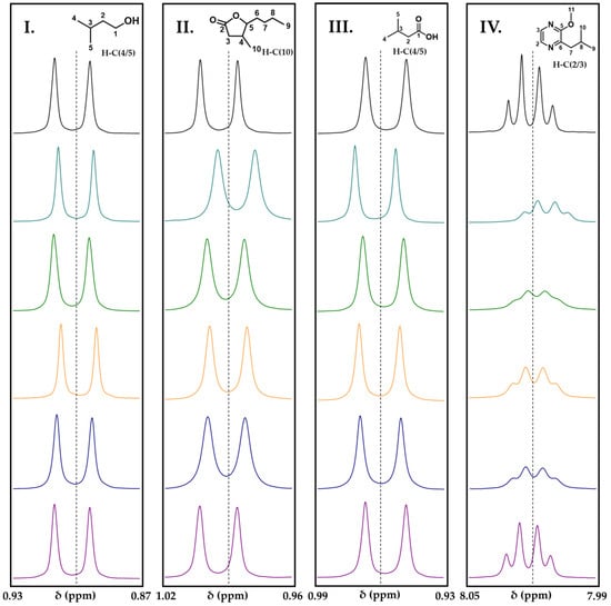 Excerpts of qHNMR spectra (400 MHz; ethanol-d6/D2O, 14/86, v/v; pH 3.8; 298 K) of NMR-based interaction studies of 3-methyl-1-butanol (I), cis-whisky lactone (II), 3-methylbutanoic acid (III), and 3-isobutyl-2-methoxypyrazine (IV) with HMW fractions after chemical degradation of HMW fraction 30–50 kDa (control solution without HMW (black), native HMW (light blue), HMW after alkaline hydrolysis (green), HMW after acidic hydrolysis with H2SO4 (orange), HMW after thiolytic depolymerization (dark blue), and HMW after acidic hydrolysis with HCl (purple)) in equal concentration (2.89 g/L) after 30 min of incubation at RT.