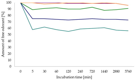 Percentage of the free 3-isobutyl-2-methoxypyrazine in the solution after various incubation times (5 min–96 h) with the HMW 30–50 kDa fraction (2.89 g/L) after different chemical degradations (light blue: native polymer; green: polymer after alkaline hydrolysis; orange: polymer after acidic hydrolysis with H2SO4; purple: polymer after acidic hydrolysis with HCl; dark blue: polymer after thiolytic depolymerization). Values were calculated in relation to the control solution without added HMW fraction. According to the validation of the qHNMR approach in the literature [], the precision of the method was found to be ≤2%.