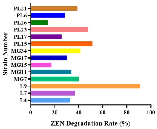 Using ZEN as the sole carbon source, 14 strains with the potential to degrade ZEN were screened from 108 food sources. The 14 strains were inoculated (10 μg/mL) in liquid medium containing ZEN and their ZEN toxins were detected by HPLC. As can be seen from Figure 1, the L9 strain isolated from moldy corn had the highest degradation rate of 91.14%, while the remaining 13 strains all had degradation rates of less than 56.8%.